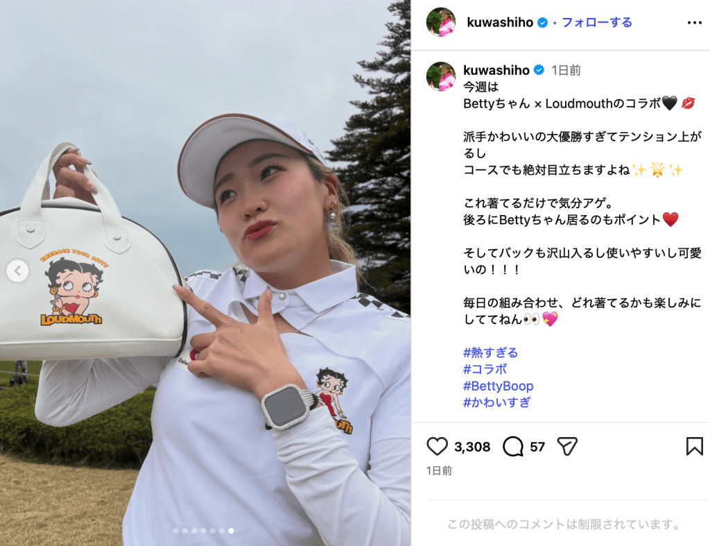 投稿されたのは、ゴルフアパレルブランド「LOUDMOUTH」とベティちゃんのコラボウェアに身を包んだ桑木の姿。コラボバッグを持ち「派手かわいいの大優勝すぎてテンション上がるしコースでも絶対目立ちますよね」「後ろにBettyちゃん居るのもポイント」と興奮気味に伝えた。