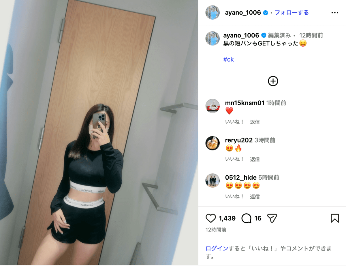 「黒の短パンもGETしちゃった」と投稿されたのは、園田がファッションブランド・カルバンクラインのウェアを着て鏡に向かって自撮りをしている写真。上下黒のトップスと短パンで、スポーティーなコーディネートになっている。
