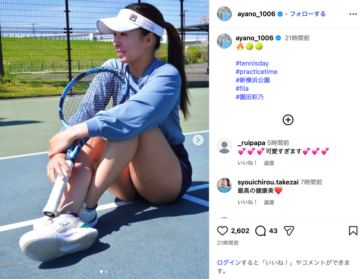 女子プロテニス選手の園田彩乃(30)が4月12日、Instagramを更新。自身の近影を公開した。