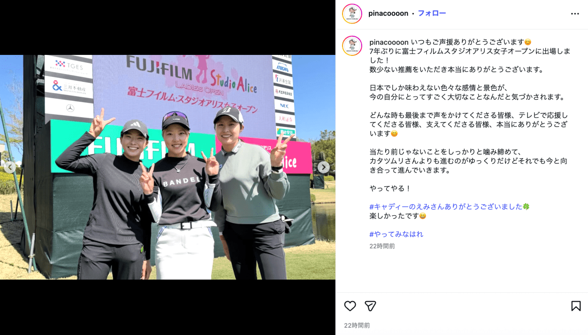 さらに、現地やテレビで応援するファンや関係者に向けて謝意を示し、「当たり前じゃないことをしっかりと噛み締めて」と記述。「カタツムリさんよりも進むのがゆっくりだけどそれでも今と向き合って進んでいきます」と、自身の歩みについても言及し「やってやる!」と今後への意欲を示した。最後には「キャディーのえみさんありがとうございました」「楽しかったです」とキャディにも感謝を述べた。