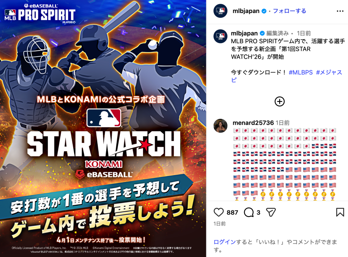 MLB Japanが4月13日、Instagramを更新。MLBとコナミの公式コラボ企画がスタートすることを発表した。