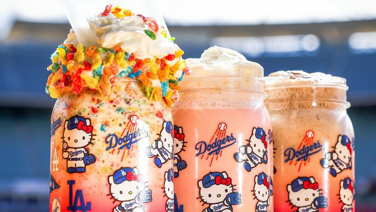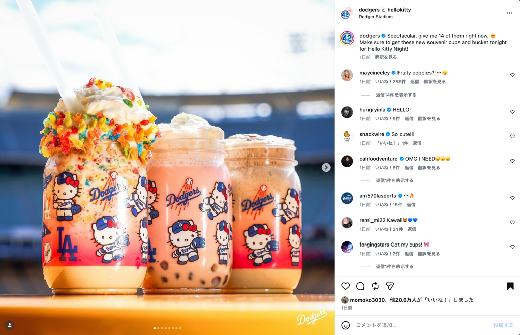 公開された写真では、ドジャースのロゴとユニホーム姿のハローキティが描かれたクリアカップが3つ並び、手前にはホイップクリームやカラフルなトッピングがたっぷり乗ったドリンクも収められている。淡いピンクやブラウンのドリンクはポップで、イベント限定らしい特別感を漂わせている。
