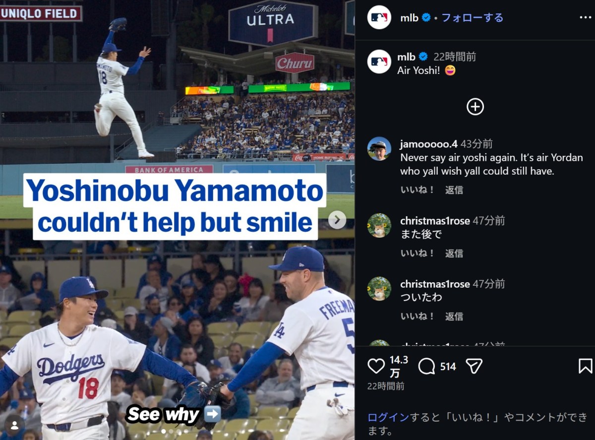 MLBが、4月15日、公式Instagramを更新。山本由伸(27)が珍しいジャンプキャッチを見せた際のビジュアルと動画を公開し、ファンの間で話題を呼んでいる。