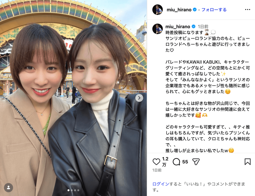 投稿されたのは、東京都多摩市のサンリオピューロランド前で撮影された平野と志田のツーショット。平野は「ちーちゃんとは好きな物が沢山同じで、今回は一緒に大好きなサンリオの仲間達に会えて嬉しかったです」とつづり、「キティ推しはもちろんですが、気づいたらプリンくんの耳も購入していて、クロミちゃんも神対応で、、推し増しが止まらない私でしたw」と楽しそうに語った。