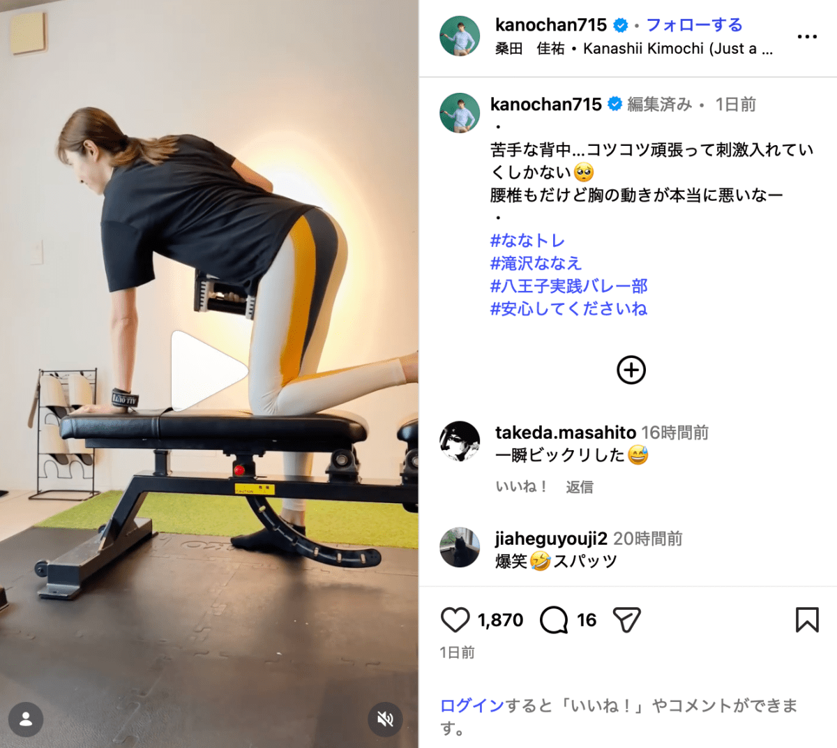元バレーボール選手の狩野舞子(37)が4月16日、Instagramを更新。自身のトレーニングの様子を公開した。