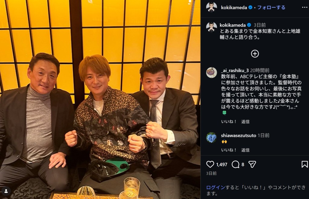 「とある集まりで金本知憲さんと上地雄輔さんと語り合う」というコメントと共に投稿された写真は、飲食店内で体を寄せ合う亀田、金本、上地の3ショットだ。亀田は、スーツ姿のおなじみのガッツポーズを決めており、その隣で上地はレオパード柄のアウターをまとい、にこやかな笑みを浮かべている。