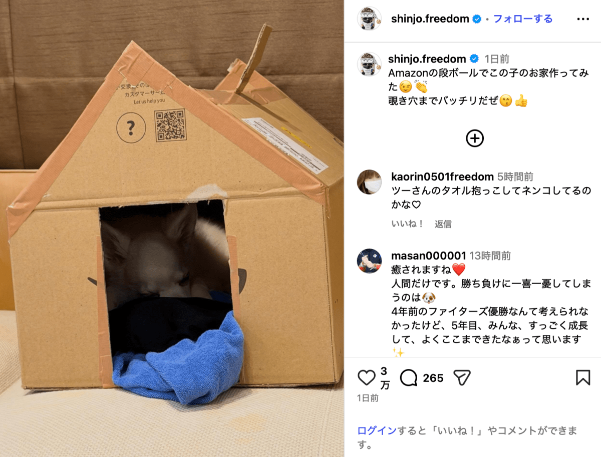 「Amazonの段ボールでこの子のお家作ってみた」と投稿されたのは、Amazonの段ボールをガムテープで接着して作った新庄お手製の犬小屋の写真。中で愛犬がくつろいでおり、「覗き穴までバッチリだぜ」と満足げにつづった。