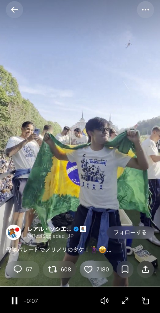 「優勝パレードでノリノリのタケ!」と投稿されたのは、優勝パレード中の久保の様子。久保はブラジル国旗を羽織り、腰を振って全身で喜びを表現している。他の選手たちが笑顔でスマホ撮影している様子も見受けられた。