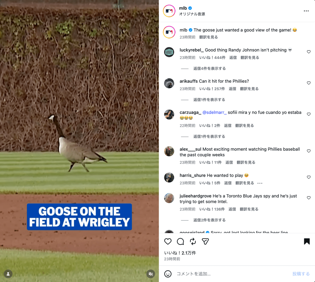 MLB公式Instagramは4月21日に投稿を更新し、カブス対フィリーズ戦で球場にガチョウが乱入した珍場面を公開した。舞台となったのはリグレー・フィールドで、試合中にフィールドへ姿を見せたガチョウが、思わぬ形で注目を集めている。