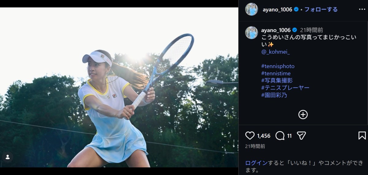 「こうめいさんの写真ってまじかっこいい」という感嘆のコメントと共に投稿された写真は、太陽をバックに、力強いショットを放つ園田の姿を収めたもの。ミニスカートをなびかせつつ、園田が逆光の中で真剣な表情を浮かべるドラマチックな一枚だ。撮影した長浜氏は、錦織圭(36)や西岡良仁(30)らトップアスリートを撮影するカメラマン。躍動する園田の「今」と、プロの技術が融合した写真となっている。