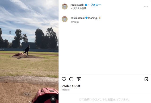 「loading..」というコメントと共に公開された動画には、マウンドからキャッチャーに向けて球を投げ込む佐々木の様子が捉えられている。投稿には、サンディエゴ・パドレスのダルビッシュ有(38)、ニューヨーク・メッツの千賀滉大(31)が“いいね”で反応した。