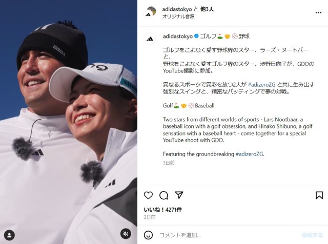 「ゴルフをこよなく愛す野球界のスター、ラーズ・ヌートバーと、野球をこよなく愛すゴルフ界のスター、渋野日向子が、GDOのYouTube撮影に参加」と投稿された動画は、アディダスのウェアに身をつつんだ渋野とヌートバーが、ゴルフをプレーする様子を捉えたもの。2人がショットを決める様子の他、キャッチボールする場面も見られ、和やかな雰囲気が伺える。
